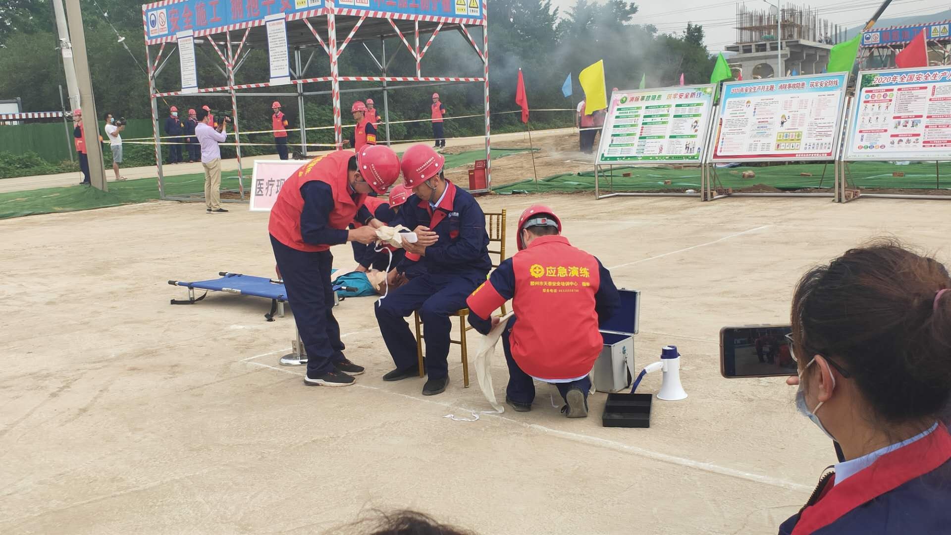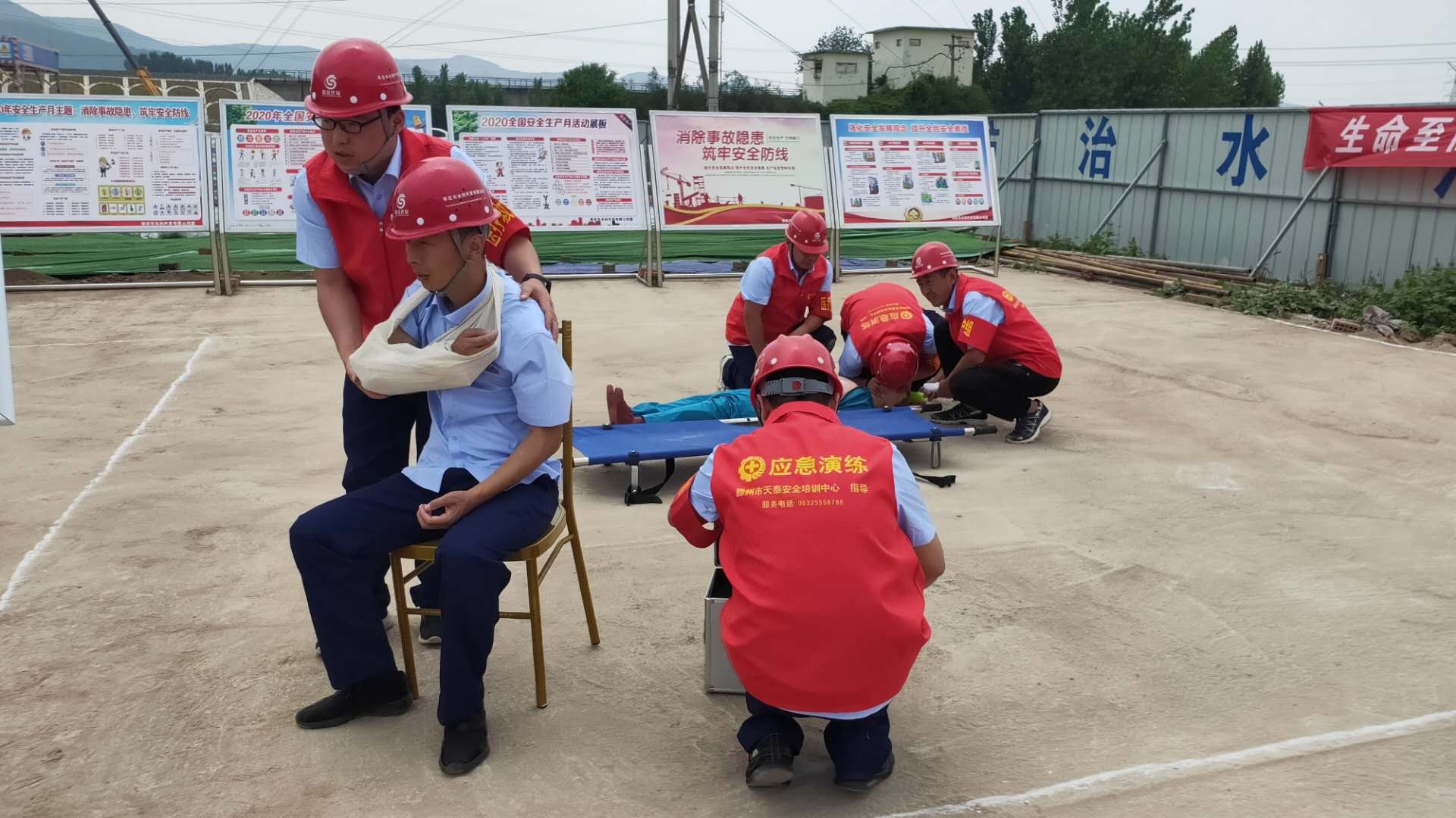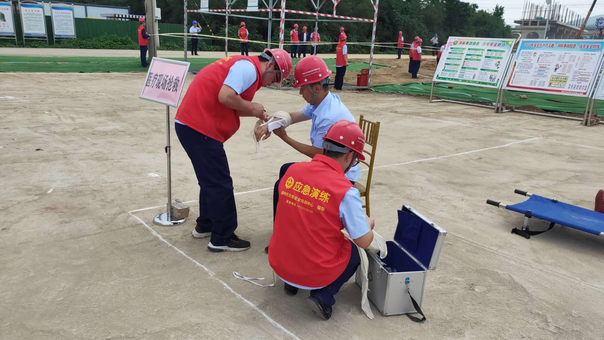 本次演練模擬事故情形為:市中區(qū)東王莊閘除險加固工程施工現(xiàn)場,模板加工廠電線線路短路引發(fā)火災,員工在實施初級滅火救援中1人不慎觸電,1人在施救時受到機械傷害,公司啟動《棗莊市水利開發(fā)有限公司生產(chǎn)安全事故綜合應急預案》一級響應。成立現(xiàn)場指揮部,指揮各救援職能組應急救援隊伍進行快速、準確的滅火救援,對傷者進行CPR及止血、包扎、固定、搬運等救護技能操作,在各救援職能組的全力配合下,圓滿完成此次應急救援任務。